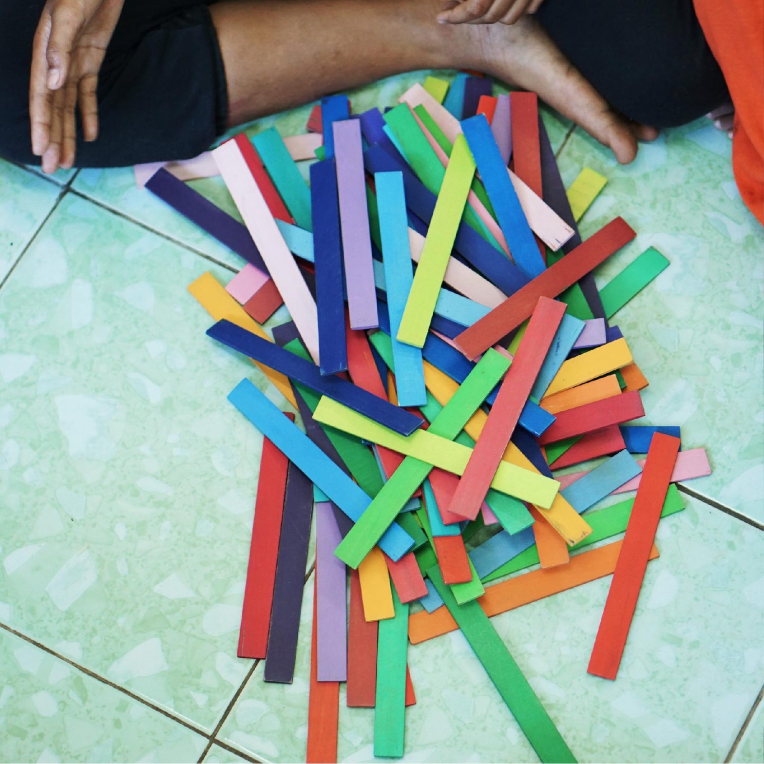 游戏时间到!孩子们发挥创意,转眼就把五颜六色的木棒变成游戏材料,玩起捡棒子游戏。 游戏规则就是要利用一根木棒,在众多木棒里以不碰触的前提下,能够挑出木棒者就可顺利过关,而挑出最多木棒者就是赢家。孩子们在全神贯注地玩游戏的同时,也训练了他们的专注力以及手眼协调的能力,可说是一举多得!