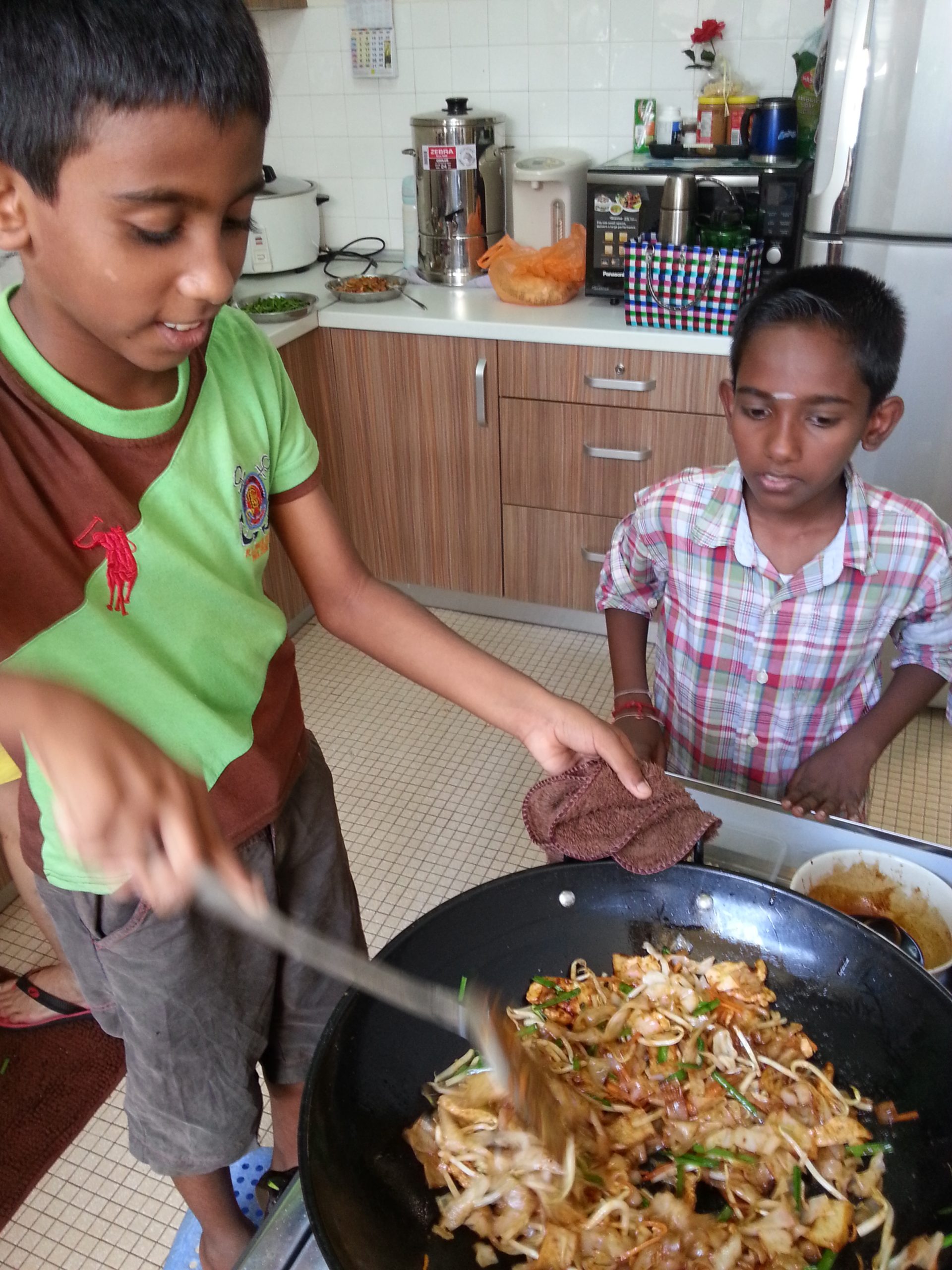 The cook is showing the children how the preparation is done. The kids start to prepare the ingredients by themselves. Adult is guided the small kid on cutting. The small kids are helping with the light work such as washing the vegetables. The children are happily learning to fry the kuey teow. The children are starting their hand on skill to fry the kuey teow. They are fully satisfied with the end result.