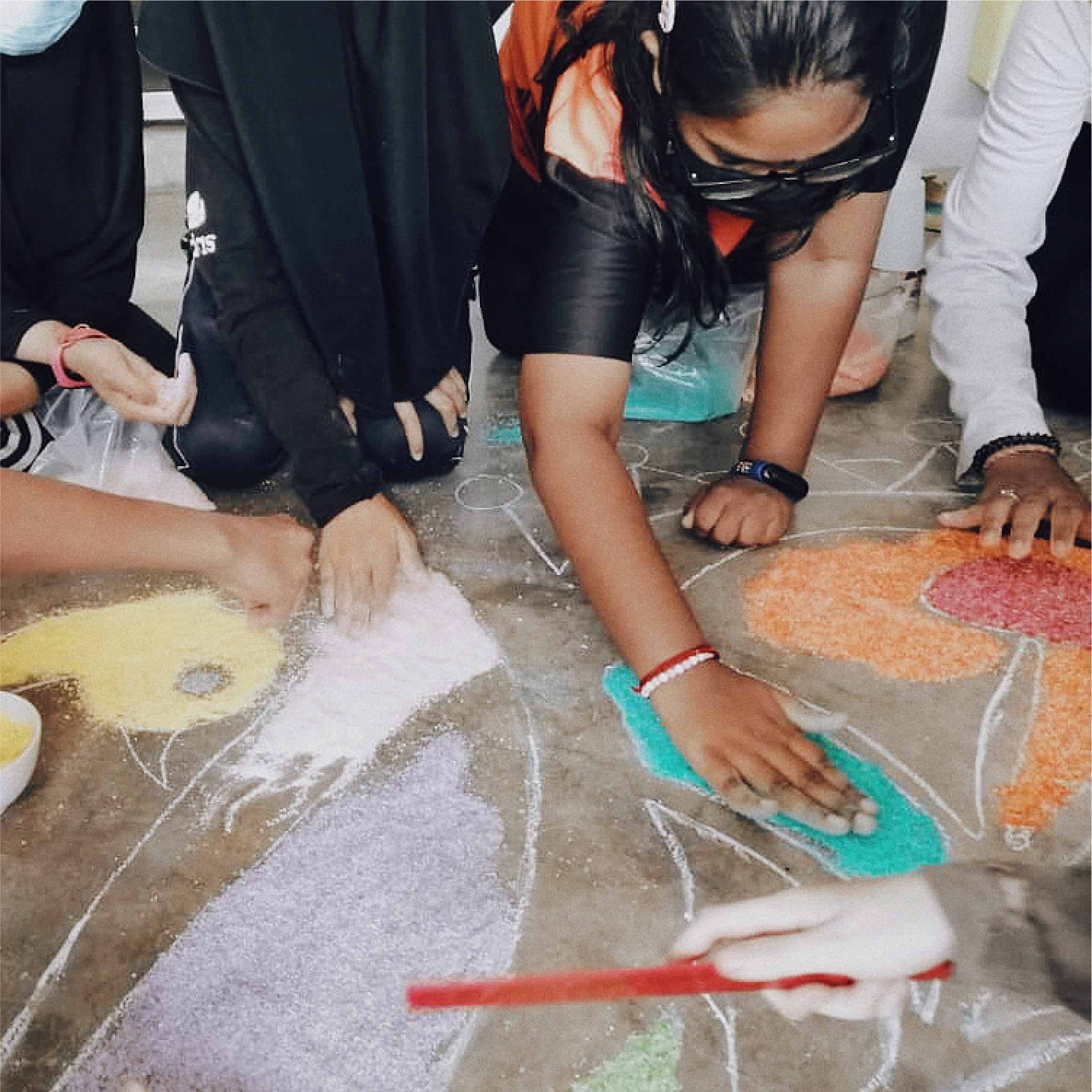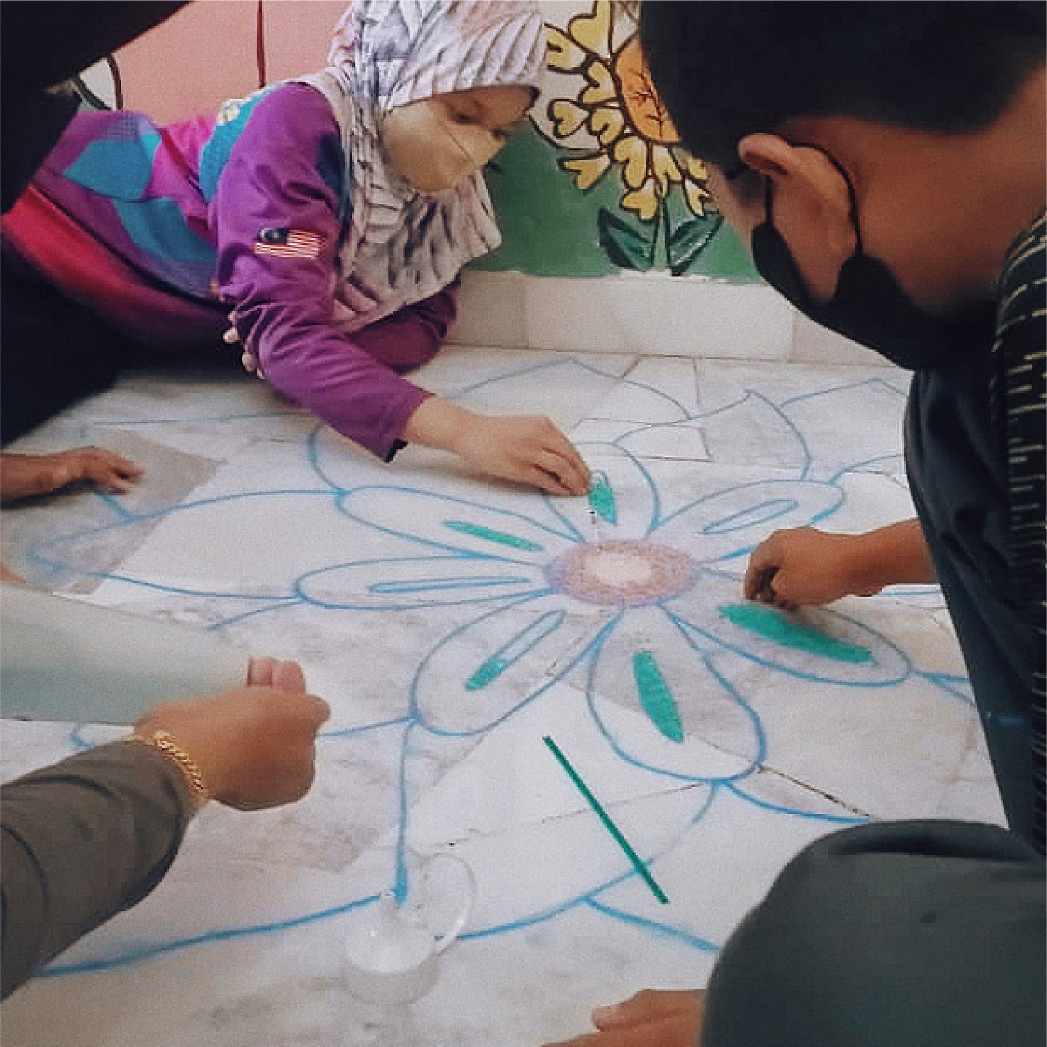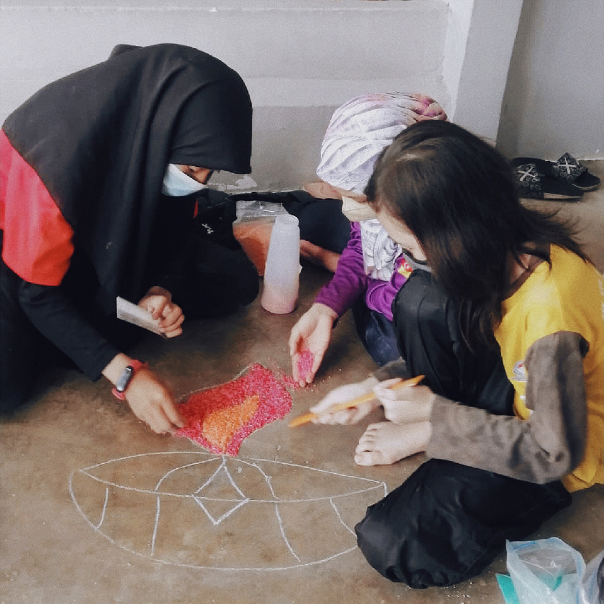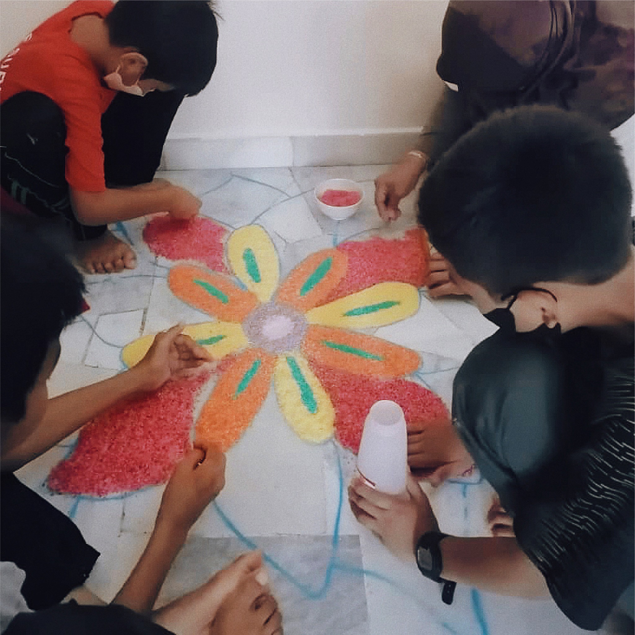 适逢屠妖节,小黄花中心举办了一个绘制“蓝果丽”活动,让孩子们体验不同佳节文化气氛。“蓝果丽”是印度的一种传统地画艺术,一般用手工绘制在地板上或家门前。这种象征着幸福,正能量,好运以及欢迎来宾的地画艺术在印度族群广受欢迎。马来西亚是个全年充满各种不同节日文化气息的国家,这也是一个绝佳机会让孩子亲身经历,体验不同文化活动的乐趣。