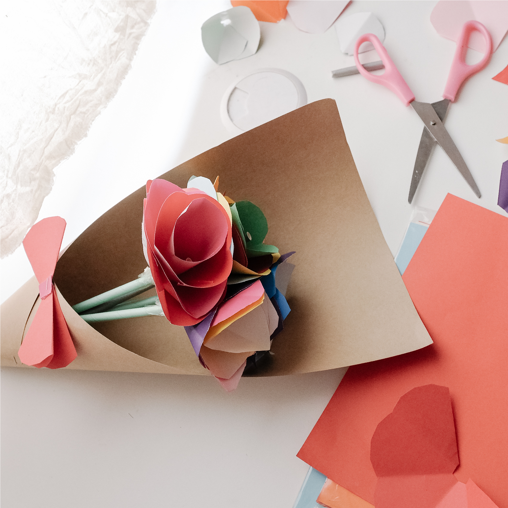 为了庆祝来临的母亲节,我们把普通的颜色纸,变成充满意义,五颜六色的花束