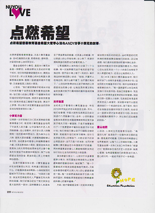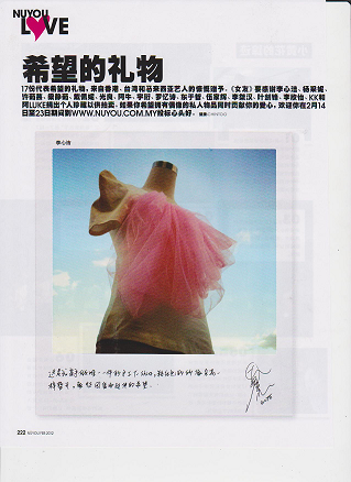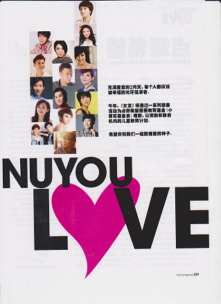 爱洋溢,2月天。《女友》杂志为小黄花举办了为期一个月的系列筹款活动——NüYou LOVE,此筹款活动分3个阶段进行,联合了来自四方的力量促成这桩美事;其中包括了结合了艺人力量的捐赠私物网拍,由商家赞助的香槟瓶设计活动,以及涉及广泛群众力量的周末慈善义卖会。