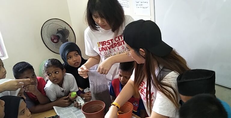 一群First City University的学生于小黄花中心完成他们的实习项目. Fir …