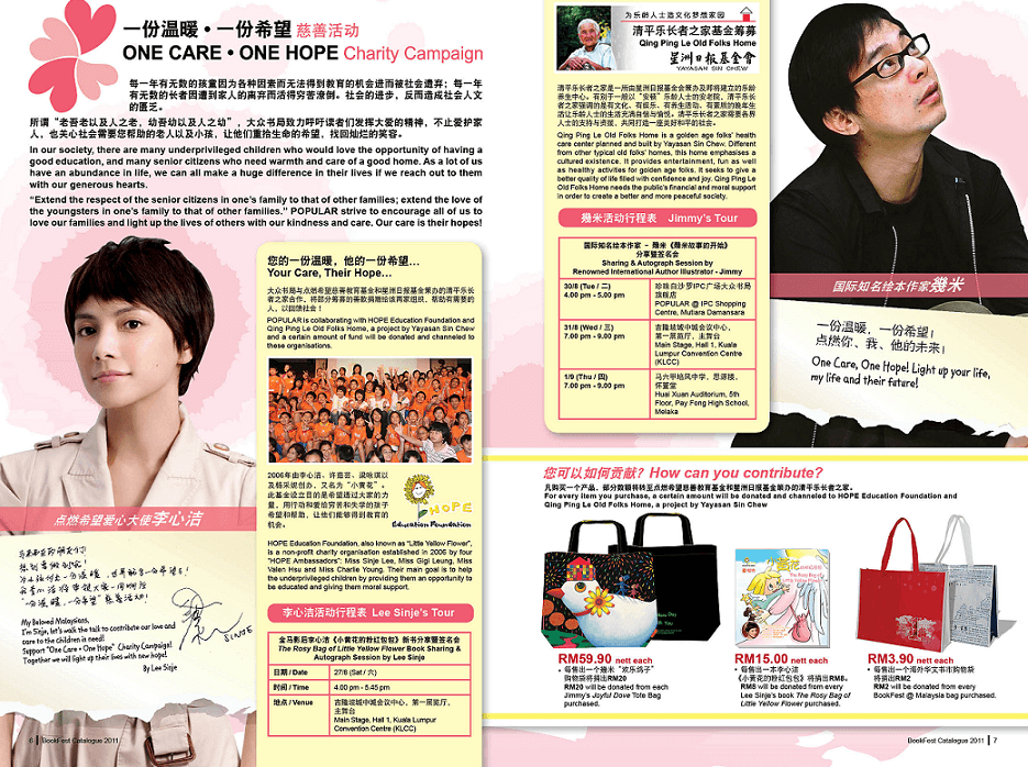 In conjunction with the “6th Malaysia Bookfest” of Kuala Lumpur and Penang, year 2011, the main organizer, SinChew Daily and Popular has organized charity sales with the theme of “One Care.One Hope”. The campaign has been carried out until the end of the years. Fund raised was contributed to two different foundations: the Yayasan Sinchew and Little Yellow Flower (formerly known as Hope Education Foundation). Popular has also printed 3000 copies of <The Rosy Bag of Little Yellow Flower> to be sold. In the Malaysia edition, the books printed in soft cover and an additional front and back flat introducing Sinje and Hope Education Foundation. The author cum founder of Little Yellow Flower, Lee Sinje has also attended a sharing and book signing session during the Bookfest, as one of the highlighted activities of the event.